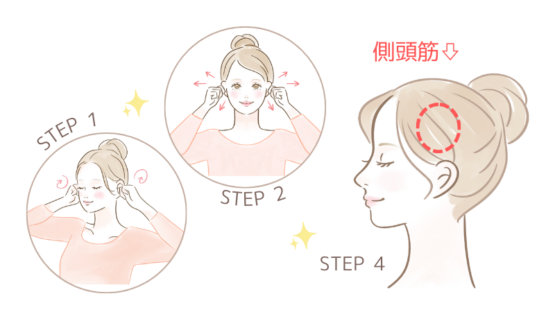 人差し指と中指で耳を挟むようにし、耳の付け根(前と後ろ)を上下にこすって刺激します。 - 側頭筋をほぐす
