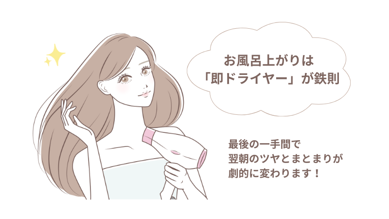 お風呂上がりは自分を後回しにせず、即座に乾かすことが10年後のツヤ髪を作ります。
